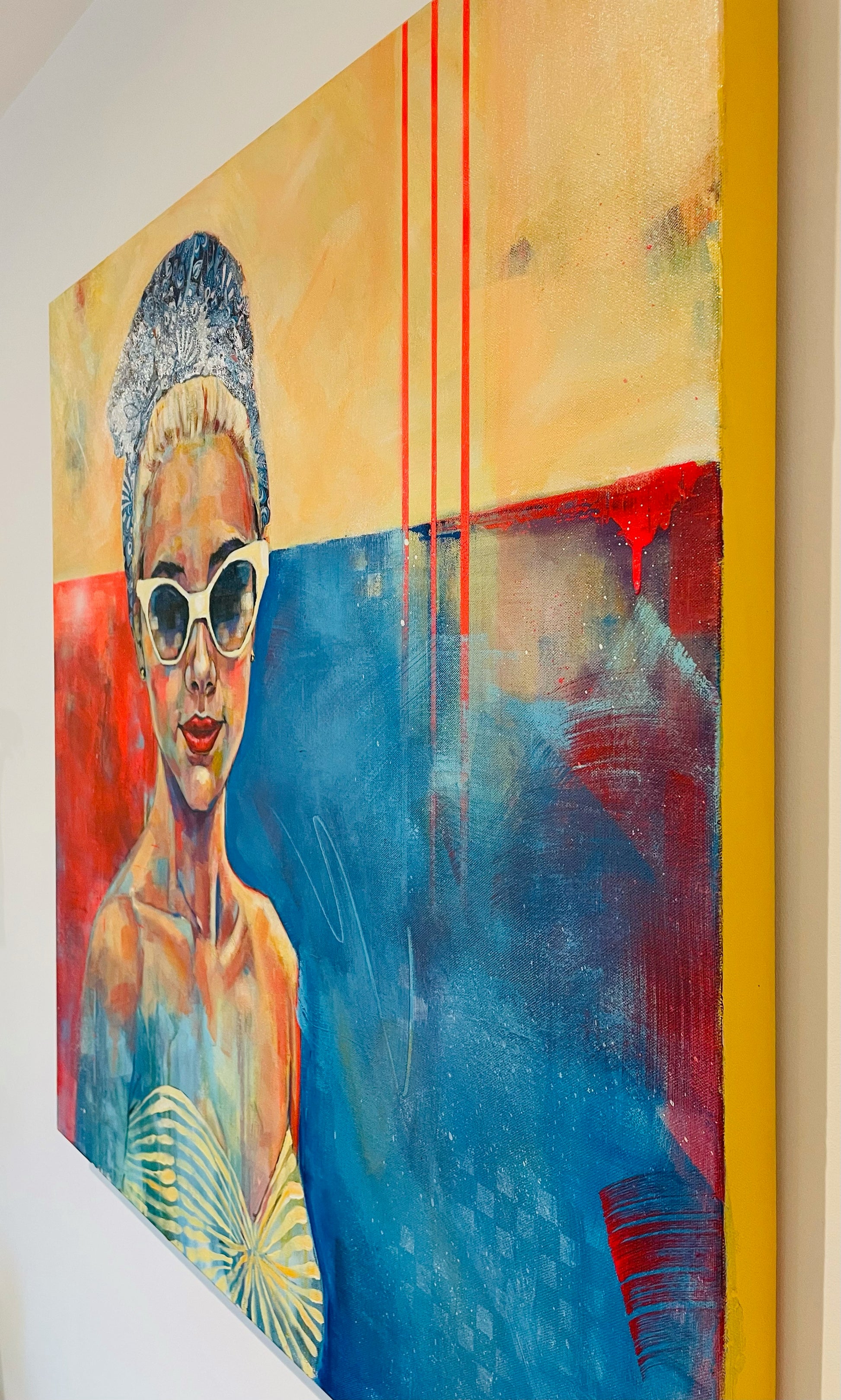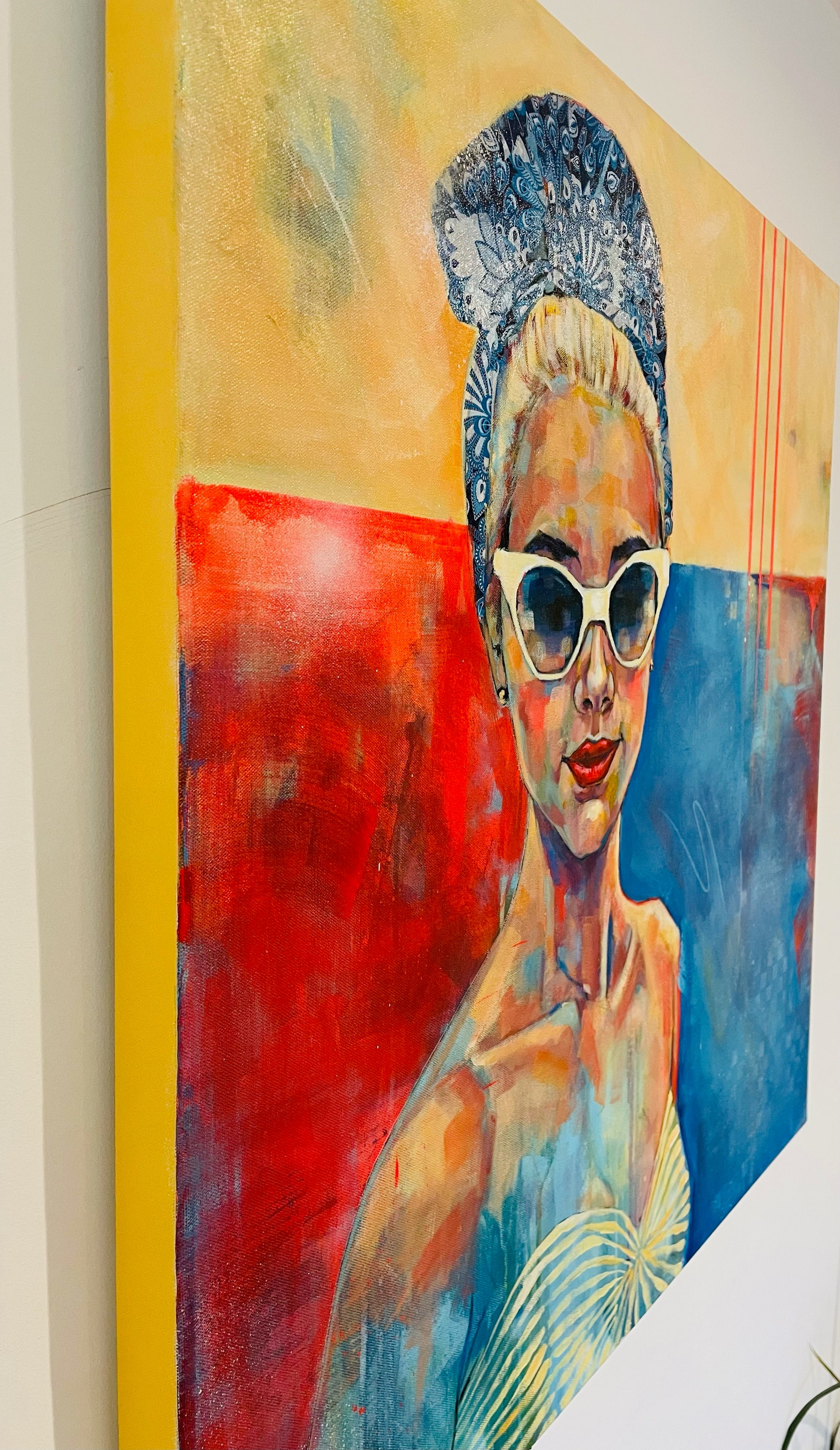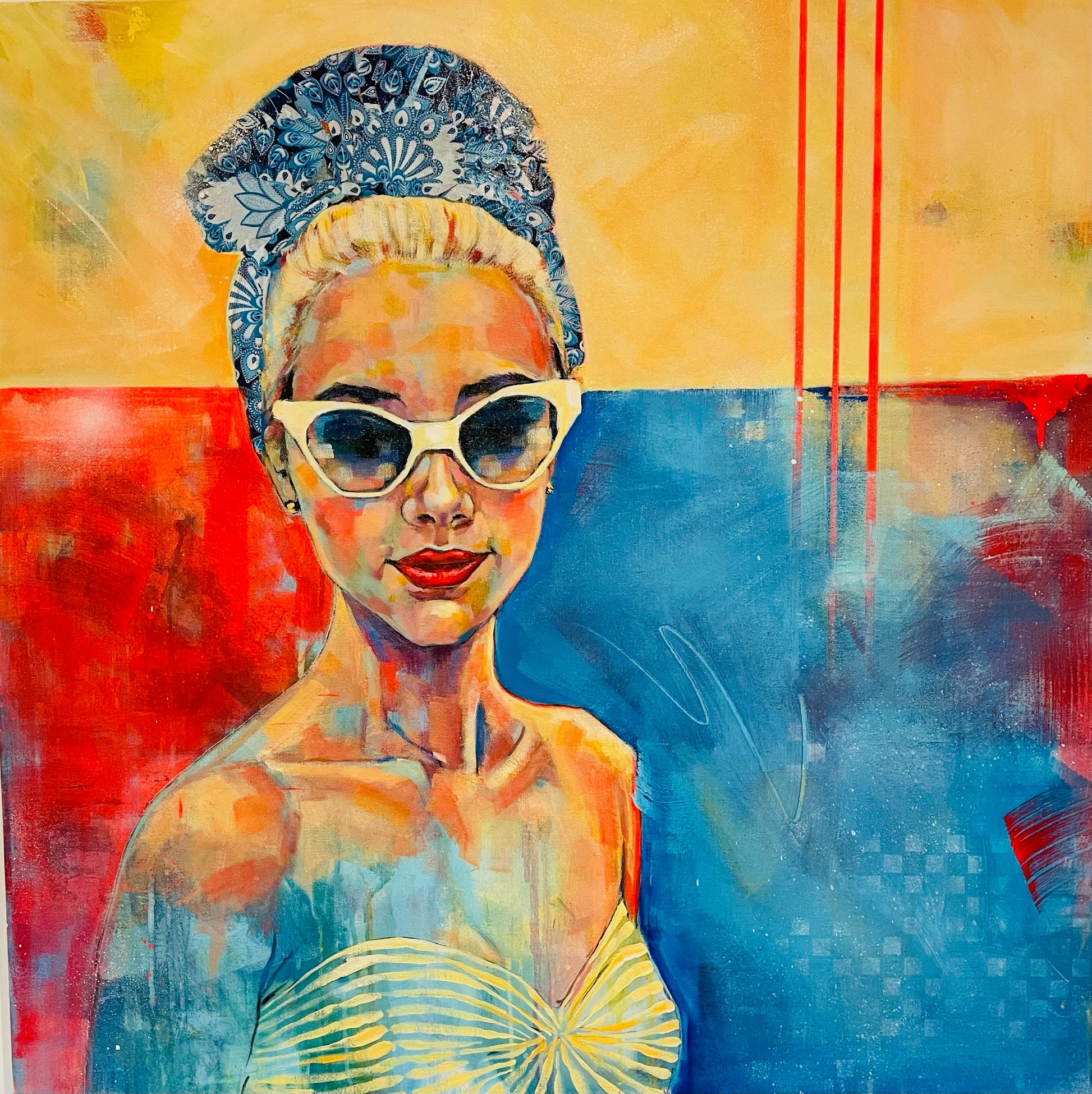 Summery yellows and deep blues, depicting the quintessential retro beach girl. Exuding warmth, she is glamorously playful.